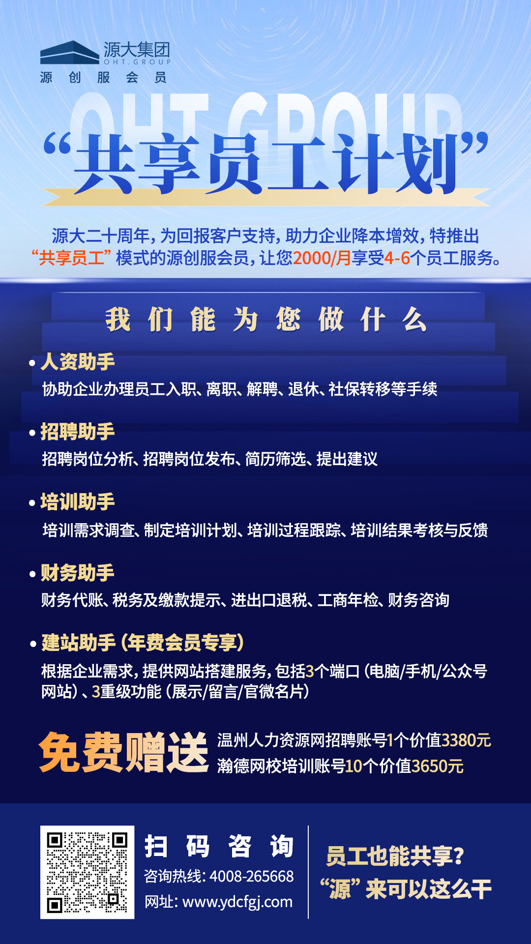源大二十周年庆推出“共享员工”计划,原价4000元/月,现在只需2000元/月。让企业每个月花费不到1个员工的工资,就能获得5项服务,包括人资、招聘、培训、财务、建站。