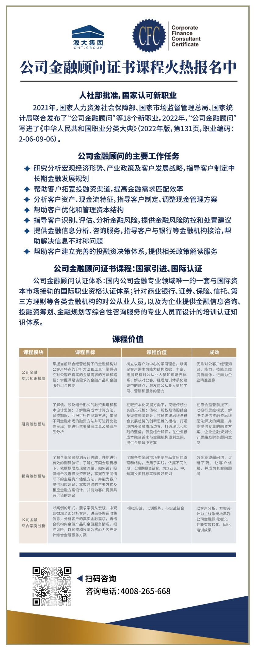 近年来,国家对企业的财务合规和金融监管力度不断加强。同时,企业对投资、融资和资金管理等方面的需求也在增加。因此,各金融机构和企业对于“金融智囊”可谓是求贤若渴。再加上,人社部等三部委于2021年3月联合发布了“公司金融顾问”作为新职业之一,公司金融顾问正式拥有了国家权威身份证,更是备受关注。毫无疑问,如公司金融顾问这类既懂企业、又懂金融的复合型人才,未来不仅在金融机构吃香,企业也有很大的缺口。