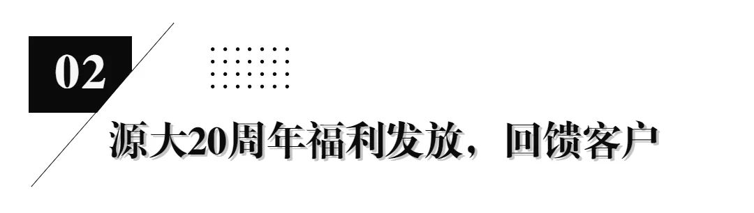 风华二十载,初心不变;源大周年庆,感恩回馈。源大成立正值20周年,特开发源大旗下系列产品会员卡,感恩回馈客户多年支持。9.9元购买源大一站会员卡,即可9折享受源大旗下所有产品 。