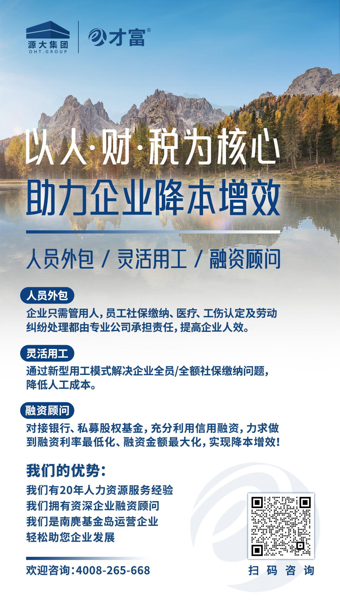 源大集团依托自身20年人力资源服务经验以及一站式创业创新服务平台的资源和优势,推出以人、财、税为核心的全新降本增效产品,助力企业攻破用工、社保、资金难题,实现促降本、保增效。