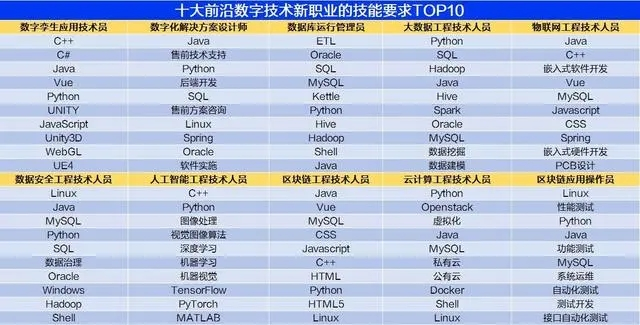 不同的数字技术新职业对具备的技能有不同的需求。从十大前沿数字技术新职业所需技能来看, Java、C++、Python、MySQL等技能排名前列。