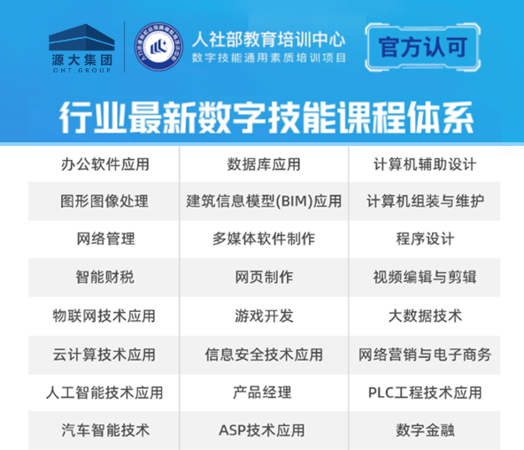 由人力资源和社会保障部教育培训中心主办的数字技能通用素质培训项目,涵盖24个热门专业科目,包括大数据、云计算、人工智能、物联网等前沿技术,以及网络营销与电子商务、智能财税、数字金融等多行业的数字化应用技能。