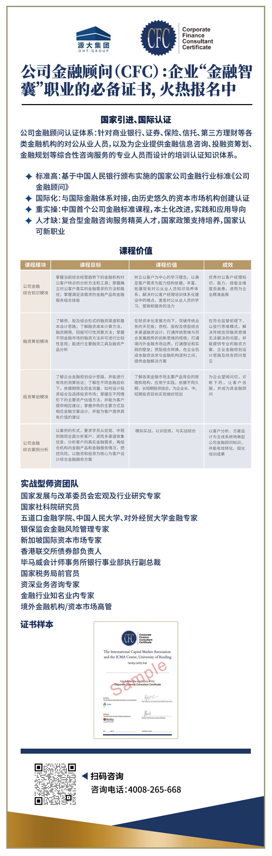 由此可见,公司金融顾问(CFC)认证,作为国内公司金融专业领域唯一的一套与国际资本市场接轨的国际职业资格认证体系,其专业性和含金量已得到地方政府的认可。