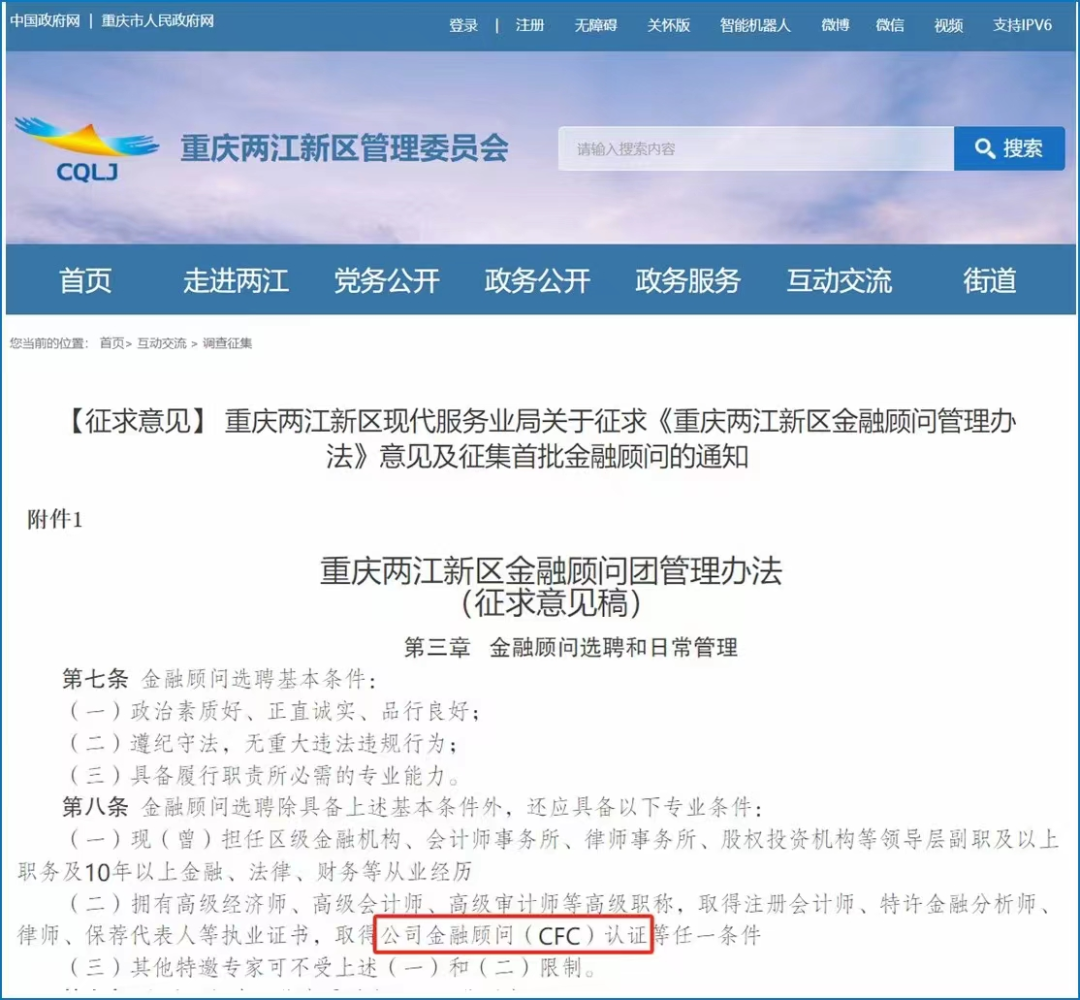在《重庆两江新区金融顾问团管理办法》(征求意见稿)中,取得公司金融顾问(CFC)认证被列为金融顾问的选聘条件之一。