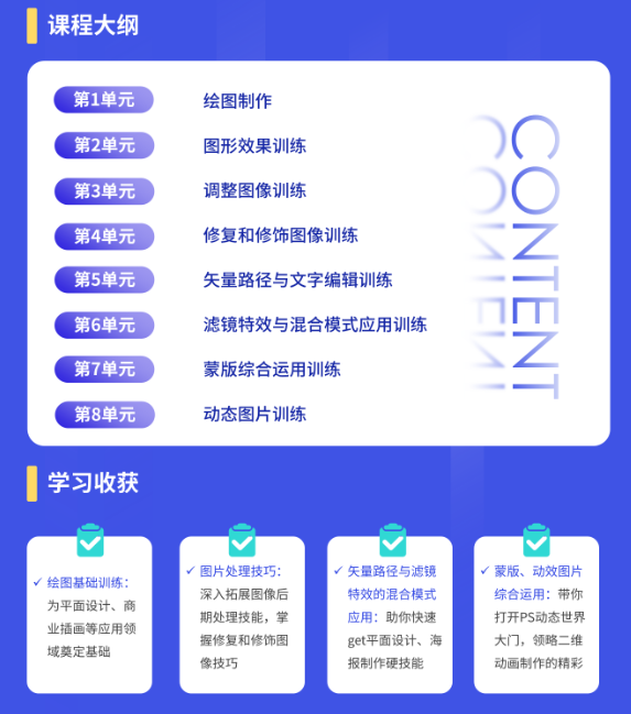 为了方便大家更有效地学习,小编特地准备了一份PS入门课程+PS进阶课程,无需安装PS软件,实训仿真学习环境,分布图示辅导,即学即练,易上手。
