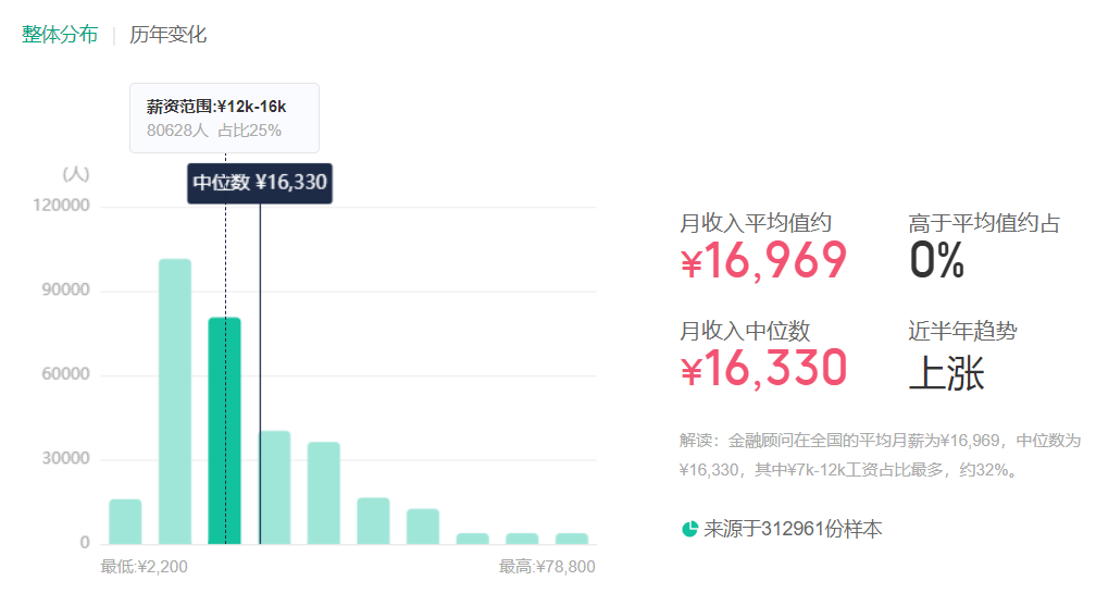 据有关数据统计,全国范围内平均月薪为 16,969元,中位数为16,330元,最高可达78,800元/月。(数据来源于312961份样本,结果仅供参考。)